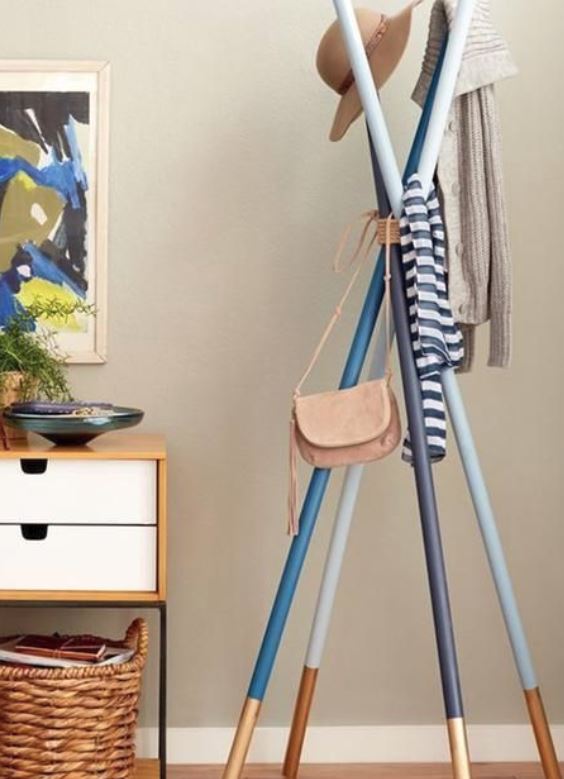 8.ขอเอาใจสายมินิมอลบ้างละกัน สำหรับคนชอบความเรียบงาม แนะนำวิธีนี้เลย นำท่อนไม้มาเรียงต่อกัน ซ้อนกันเป็นแนวตรง บน – ล่าง แค่นี้ก็ได้ที่แขวนเสื้อผ้า แถมยังแขวนของใช้ได้อีกด้วย